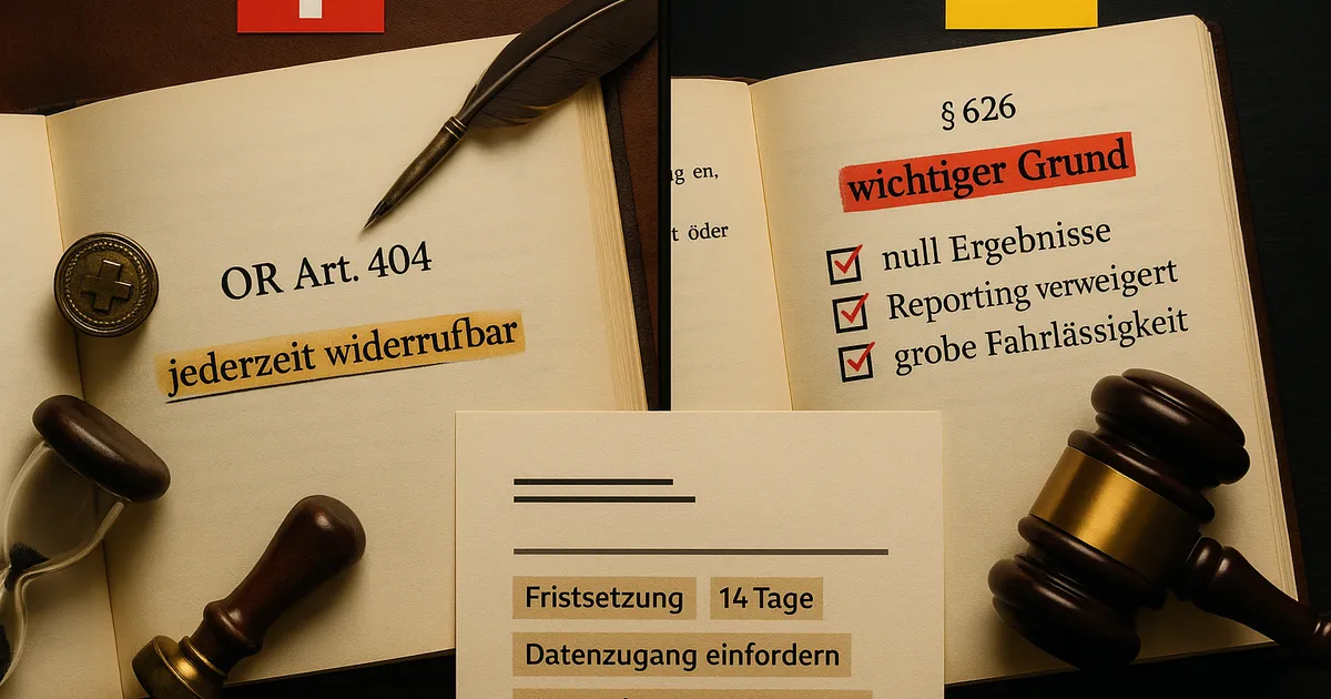 Viele Geschäftsführer glauben, sie seien an einen SEO-Vertrag „gekettet”, auch wenn die Agentur nicht liefert. Das stimmt nicht. Sowohl das Schweizer Obligationenrecht als auch das deutsche BGB bieten klare Schutzmöglichkeiten – besonders bei nachweislicher Nichterfüllung.